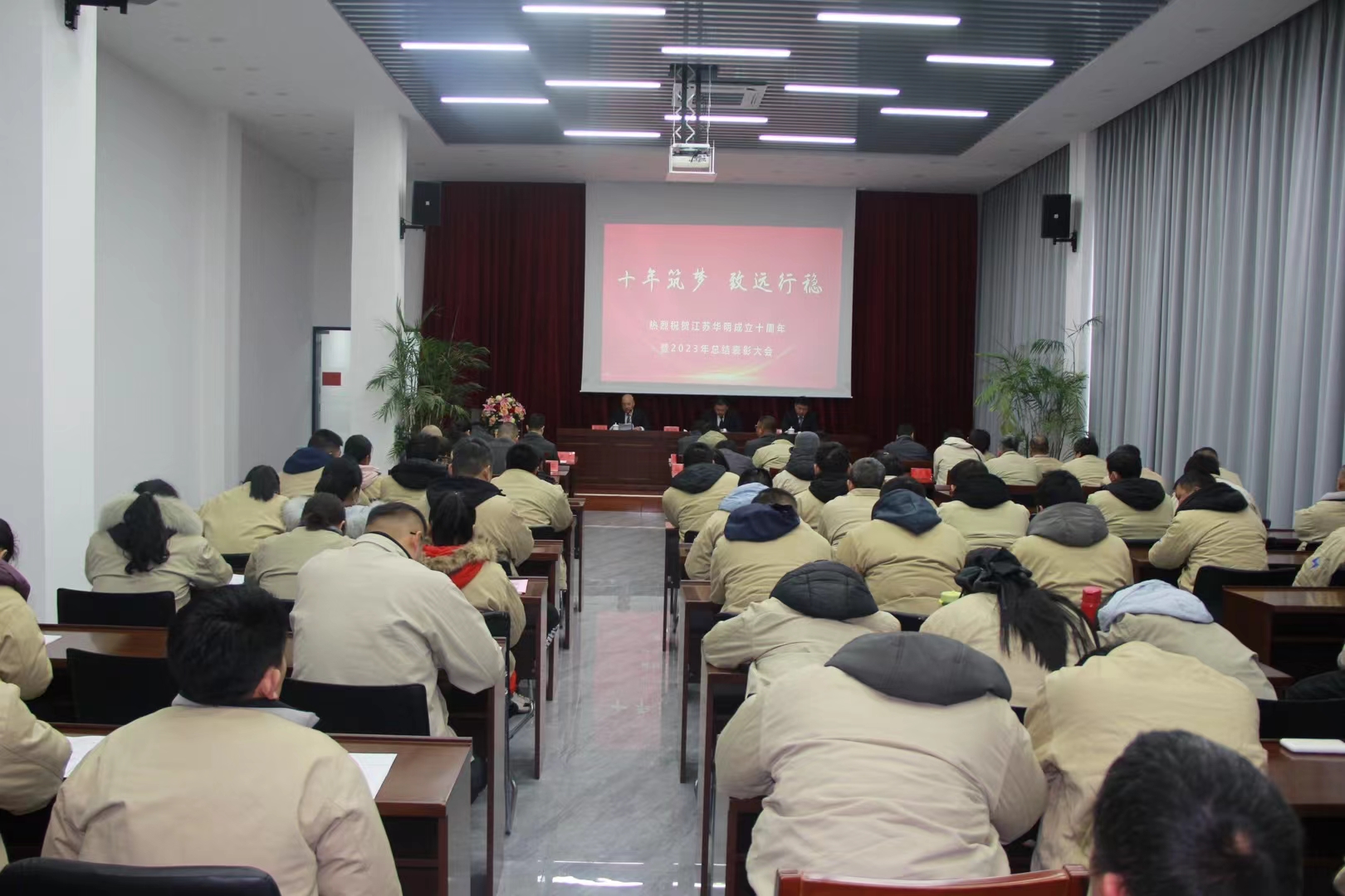 早上七点半 ,宿迁公司全体员工在办公楼前加入了升旗仪式并寓目了烟花燃放 ,随厥后到多功效聚会室加入2023年度总结表扬大会。全体员工欢聚一堂 ,回首公司十年创业路 ,总结2023年取得的各项效果与缺乏之处 ,盛大表扬2023年度为公司生长做出突出孝顺的优异员工 ,剖析形势、展望未来 ,安排安排2024年度主要事情事项。