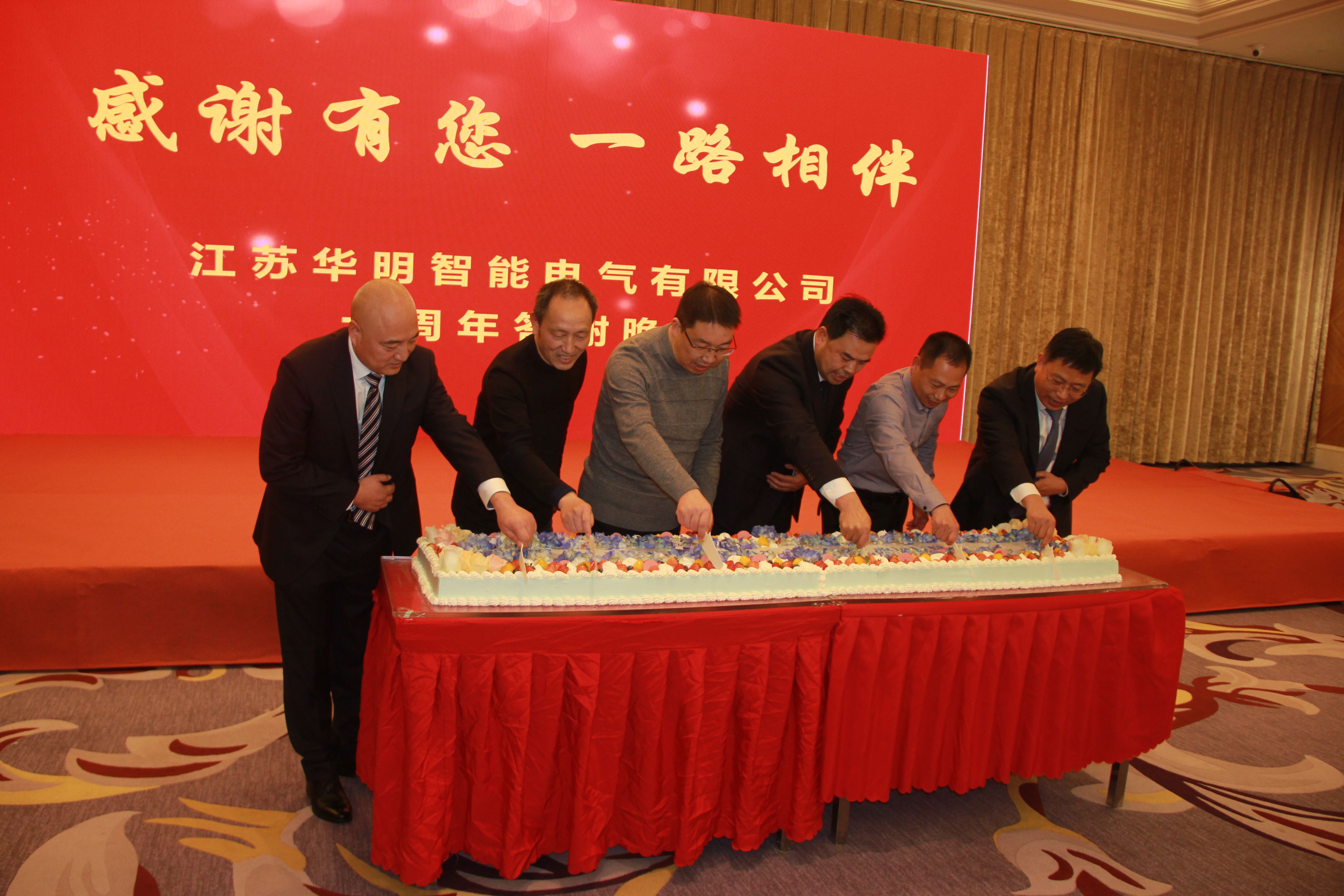 当天晚上 ,以“十年扎根、建基筑梦、初心不改、致远行稳”为主题的江苏华明智能电气有限公司十周年庆典答谢晚宴在宿迁市恒力旅馆二楼多功效厅盛大举行。
